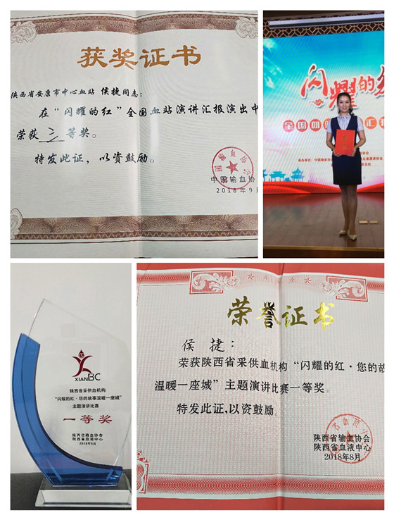 我站血源管理科侯捷同志,根據(jù)自己血站崗位工作成長(zhǎng)經(jīng)歷,結(jié)合血源一線招募典型事例,充分展示安康無(wú)償獻(xiàn)血招募宣傳模式,以“成長(zhǎng)在生命年輪中的信仰”為題,代表安康市中心血站參加陜西省“閃耀的紅--您的故事溫暖一座城”血站系統(tǒng)演講比賽,以獨(dú)特的視角和演講效果奪得冠軍,并選派于9月21日代表陜西省采供血行業(yè)參加“閃耀的紅”全國(guó)血站演講比賽榮獲三等獎(jiǎng),是我站首次在全省、全國(guó)演講比賽中取得的最佳成績(jī),為我站在全國(guó)范圍內(nèi)贏得了榮譽(yù),為安康、陜西血站行業(yè)系統(tǒng)爭(zhēng)了光,在全國(guó)血液行業(yè)內(nèi)展示了我站職工昂揚(yáng)向上的精神風(fēng)貌。