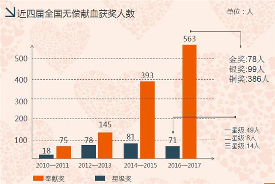 2016至2017年度安康申報(bào)全國(guó)獲獎(jiǎng)人數(shù)634人次,其中:無(wú)償獻(xiàn)血奉獻(xiàn)獎(jiǎng)計(jì)563人,金獎(jiǎng)78人,銀獎(jiǎng)99人,銅獎(jiǎng)386人 ;全國(guó)星級(jí)志愿服務(wù)獎(jiǎng)71人,一星級(jí)49人,二星級(jí)8人,三星級(jí)14人。連續(xù)五屆十年榮獲全國(guó)無(wú)償獻(xiàn)血先進(jìn)城市;安康職業(yè)技術(shù)學(xué)院被評(píng)為全國(guó)無(wú)償獻(xiàn)血促進(jìn)獎(jiǎng)單位;我站站長(zhǎng)胡章學(xué)被評(píng)為全國(guó)無(wú)償獻(xiàn)血促進(jìn)獎(jiǎng)個(gè)人。獲獎(jiǎng)人數(shù)創(chuàng)歷史新高。
