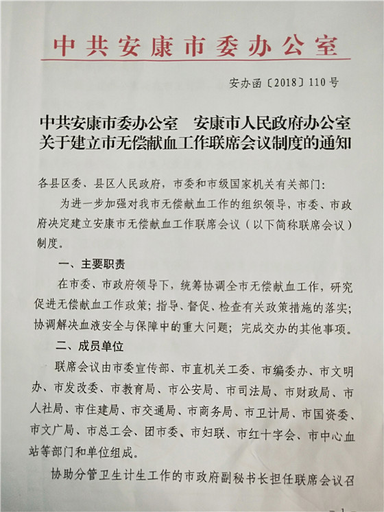 2、安康市率先在全省建立首個(gè)無(wú)償獻(xiàn)血聯(lián)系會(huì)議制度 安康無(wú)償獻(xiàn)血聯(lián)席會(huì)議制度是在安康市委、市政府領(lǐng)導(dǎo)下,由市委宣傳部等21個(gè)市級(jí)部門和單位組成,協(xié)助分管衛(wèi)生計(jì)生工作的市政府副秘書長(zhǎng)擔(dān)任聯(lián)席會(huì)議召集人。聯(lián)席會(huì)議每年召開一次全體會(huì)議,主要職責(zé)為統(tǒng)籌協(xié)調(diào)全市無(wú)償獻(xiàn)血工作,研究促進(jìn)無(wú)償獻(xiàn)血工作相關(guān)政策,指導(dǎo)、督促、檢查有關(guān)政策措施的執(zhí)行落實(shí),協(xié)調(diào)解決血液安全與保障中的重大問(wèn)題。聯(lián)系會(huì)議制度的建立,標(biāo)志著我市無(wú)償獻(xiàn)血宣傳招募模式“政府主導(dǎo)、部門協(xié)作、社會(huì)參與、城鄉(xiāng)聯(lián)動(dòng)”的發(fā)展格局和長(zhǎng)效機(jī)制得到進(jìn)一步鞏固和提升。