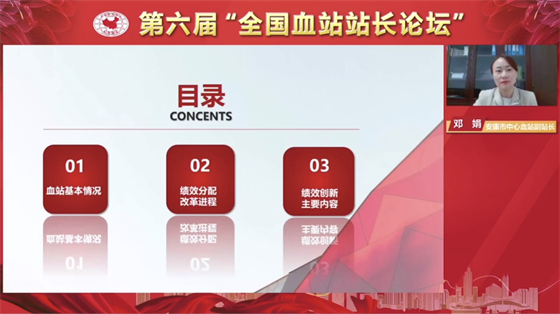 為加強(qiáng)全國血站的經(jīng)驗(yàn)交流與合作,2021年10月27日至28日,第六屆 “全國血站站長論壇”在深圳市舉辦。中國輸血協(xié)會(huì)理事長、世界衛(wèi)生組織輸血合作中心主任朱永明,深圳市衛(wèi)健委二級巡視員林漢城等相關(guān)領(lǐng)導(dǎo)出席并致辭。此次論壇的主題是“血站建設(shè)與發(fā)展、改革與創(chuàng)新”,來自全國各省、市血液中心(血站)的同仁通過線上方式參加會(huì)議。安康市中心血站副站長鄧娟作為全國血站六個(gè)優(yōu)秀論文交流發(fā)言人之一,就安康血站績效分配、改革與創(chuàng)新工作在會(huì)上進(jìn)行了經(jīng)驗(yàn)交流。