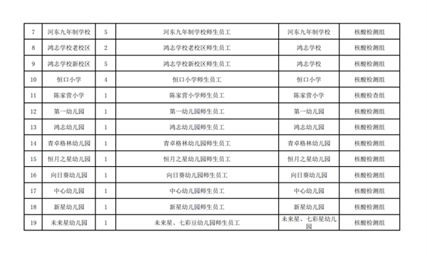 恒口示范區(qū)中心城區(qū)重點(diǎn)人群:一是黨政機(jī)關(guān)、企事業(yè)單位返崗人員、中小學(xué)校。幼兒園返校人員;二是“五一”假期有市域外旅居史人員;三是41類重點(diǎn)人群;四是市域外來恒返恒核酸檢測(cè)結(jié)果超過48小時(shí)人員;五是愿檢人員。