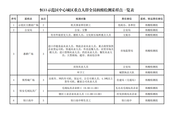 按行業(yè)、類別、區(qū)域,共設(shè)置19個(gè)采樣點(diǎn)、40個(gè)采樣臺(tái)(見附件),具體由各行業(yè)牽頭部門、責(zé)任單位統(tǒng)一安排采樣點(diǎn)設(shè)置、人員組織、秩序維護(hù),檢測(cè)對(duì)象按照牽頭部門、責(zé)任單位的具體要求,分時(shí)段有序到指定地點(diǎn)進(jìn)行采樣,避免人群聚集。