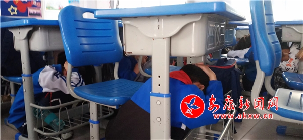 演練分為室內(nèi)緊急避險和應(yīng)急疏散兩個環(huán)節(jié)。上午9時許,隨著第一次地震防空警報聲急促響起,各班班主任立刻指導(dǎo)學(xué)生室內(nèi)防震技能,指揮學(xué)生迅速躲在各自課桌的旁邊,閉眼,蹲下身體擋住頭部。1分鐘后,再一次發(fā)出地震防空警報聲,在老師的引導(dǎo)下,各班有序秩地撤離,撤離全程不到三分鐘。
