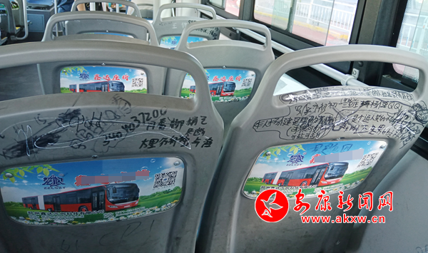 7月7日,筆者乘坐安康市城區(qū)7路公交車發(fā)現(xiàn),公交座椅靠背慘遭“涂鴉”,內(nèi)容不乏廣告標(biāo)語、低俗粗鄙、不堪入目的語言,嚴(yán)重影響乘車心情。希望廣大乘客文明乘車,還市民一個(gè)干凈整潔的乘車環(huán)境。(通訊員 成忠旭)