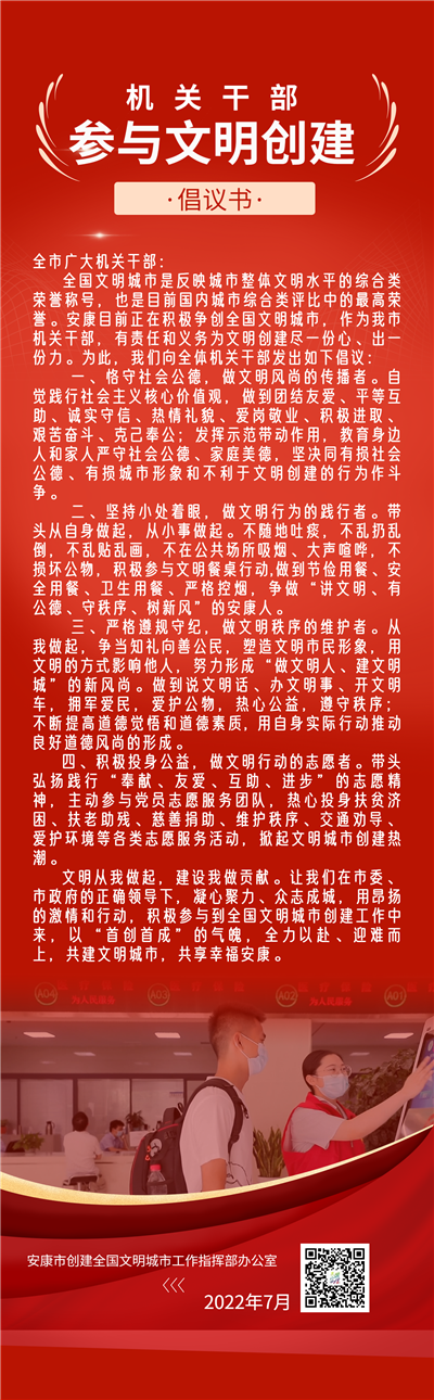 全國(guó)文明城市是反映城市整體文明水平的綜合類(lèi)榮譽(yù)稱號(hào),也是目前國(guó)內(nèi)城市綜合類(lèi)評(píng)比中的最高榮譽(yù)。安康目前正在積極爭(zhēng)創(chuàng)全國(guó)文明城市,作為我市機(jī)關(guān)干部,有責(zé)任和義務(wù)為文明創(chuàng)建盡一份心、出一份力。為此,我們向全體機(jī)關(guān)干部發(fā)出如下倡議: