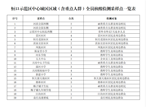 共設(shè)置20個采樣點、53個采樣臺(見附件),由相關(guān)責(zé)任單位統(tǒng)一負責(zé)采樣點設(shè)置、人員組織、秩序維護,檢測對象按現(xiàn)場工作人員要求,有序到指定地點進行采樣,避免人員聚集。