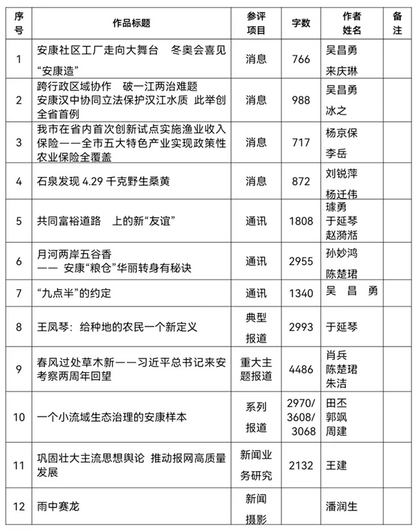 按照省記協(xié)要求,特將推薦參評2022年度陜西新聞獎初評的作品予以公示。公示期為2023年2月13日至2月17日,在此期間內(nèi)如有異議請向新聞管理部反饋。報送作品如下:?