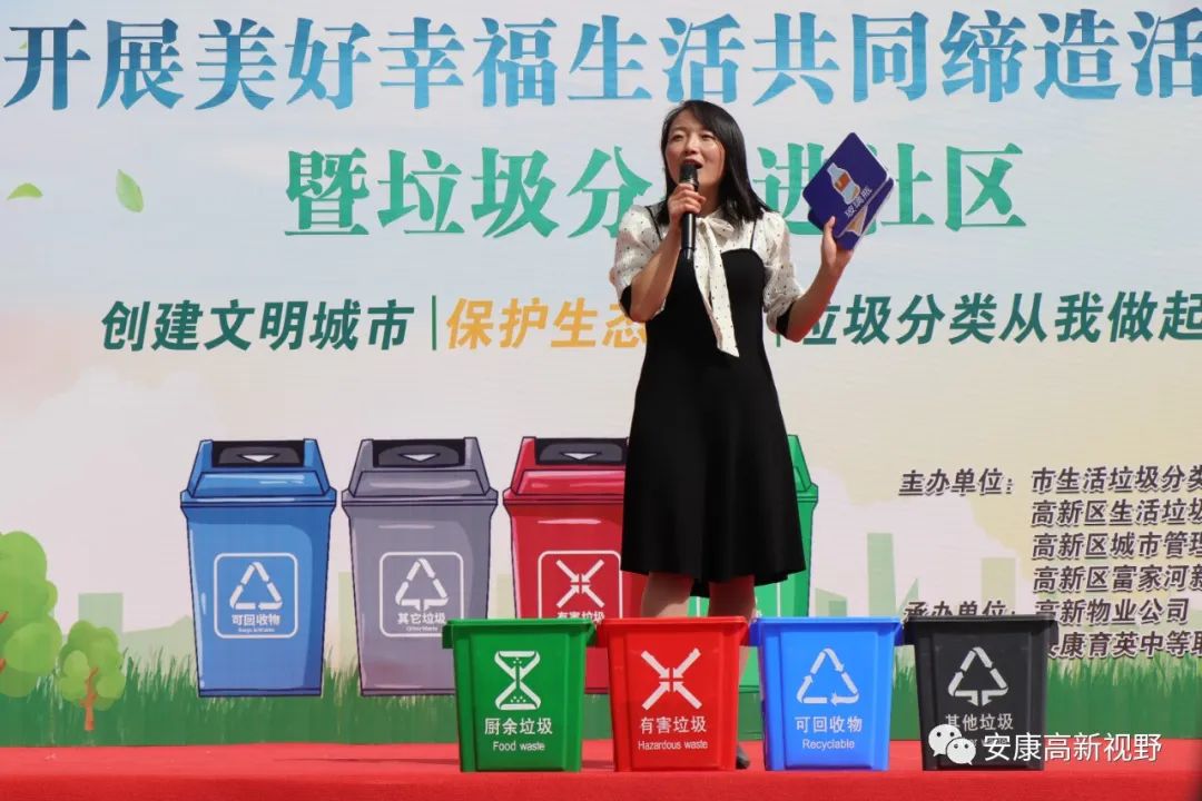 4月7日,由市生活垃圾分類辦、安康高新區(qū)城市管理執(zhí)法局、高新區(qū)生活垃圾分類辦和富家河新城黨委主辦,高新物業(yè)公司和安康育英中等職業(yè)學校承辦的“美好環(huán)境與幸福生活共同締造”暨生活垃圾分類宣傳進社區(qū)活動在富家河社區(qū)舉行。
