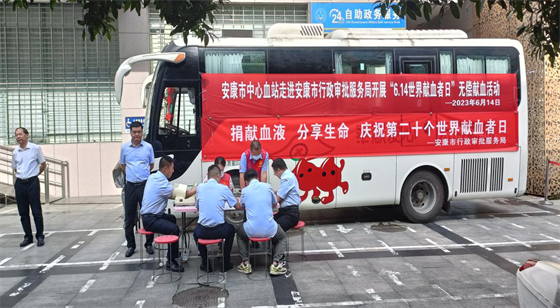 2023年6月14日,在第二十個(gè)世界獻(xiàn)血者日當(dāng)天,安康市中心血站聯(lián)合市行政審批服務(wù)局開(kāi)展了“文明有我 無(wú)償獻(xiàn)血 傳遞溫暖”無(wú)償獻(xiàn)血志愿服務(wù)活動(dòng)。