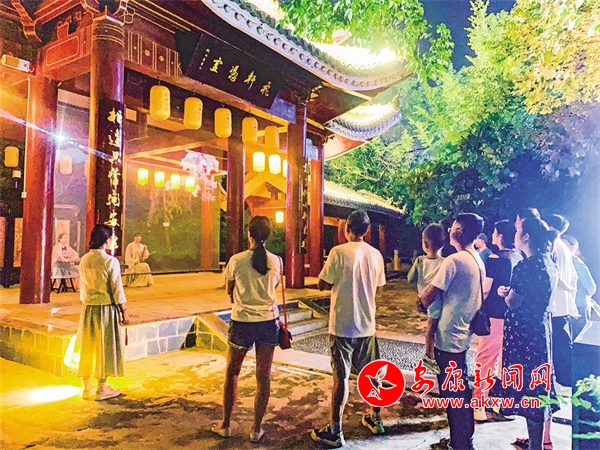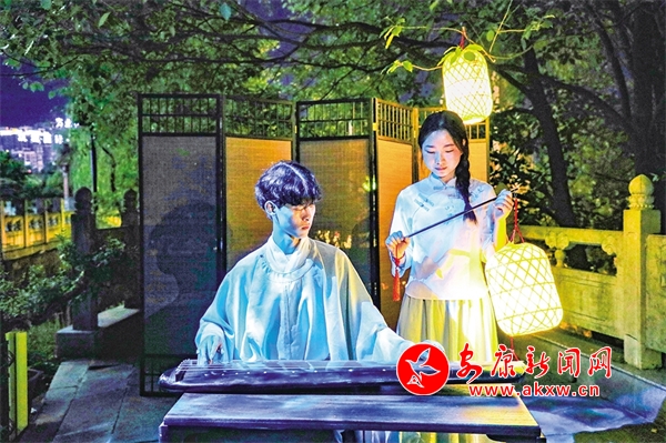 還未走近安瀾樓,就被一首琵琶曲改編的絲竹樂曲《春江花月夜》吸引,流暢多變的節(jié)奏,巧妙細(xì)膩的配器,絲絲入扣的演奏,仿佛將觀眾帶入那個(gè)月夜春江的迷人景色。環(huán)繞安瀾樓四周,畫家楊炳昌筆下的金州八景,仿佛一秒穿越古今,勝景徐徐、浮現(xiàn)腦際。