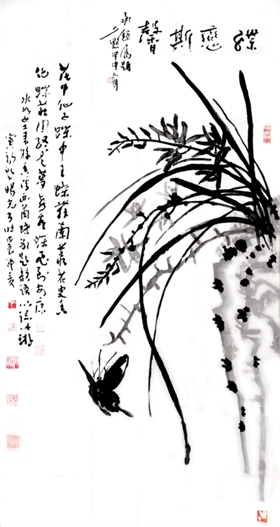 1988年,中國畫壇號(hào)稱“蝶王”的王冰如女士,以80歲高齡回到她曾工作生活10年之久的第二故鄉(xiāng)安康舉辦畫展,并且以詩書畫會(huì)友,特邀旸光先生和金州著名詩人劉寅初老人同游香溪,冰如老師興之所至,巧繪墨蝶,說道“人言寅初老弟有曹子健七步成詩之才,今日以十步為限,將此畫為題,賦詩一首,旸光老弟書于其上如何?”寅初老只走了三步便道有了,于是順口吟誦,旸光先生揮毫急就“花中仙子蝶中王,蝶舞籣叢花更香,化蝶莊周終是夢(mèng),喜看蝶王飛安康?!币还P流暢的行草躍然于畫上,相輔相成,真是詩情畫意天作之合。一幅難遇難得難覓的“三絕圖”誕生了。冰如老師感慨萬千,說到“二位弟臺(tái)才高八斗,只可惜待在安康這個(gè)貧瘠的地方被埋沒了也!”這個(gè)場面是一種巧合,正是旸光先生“萬事隨緣”的結(jié)晶,爾后經(jīng)書壇大家陳少默先生為之題跋做款,更是錦上添花,成了四絕圖。冰如、少默、旸光、寅初先生已然作古,這段翰墨丹青之情,將永存世間傳為藝術(shù)佳話。