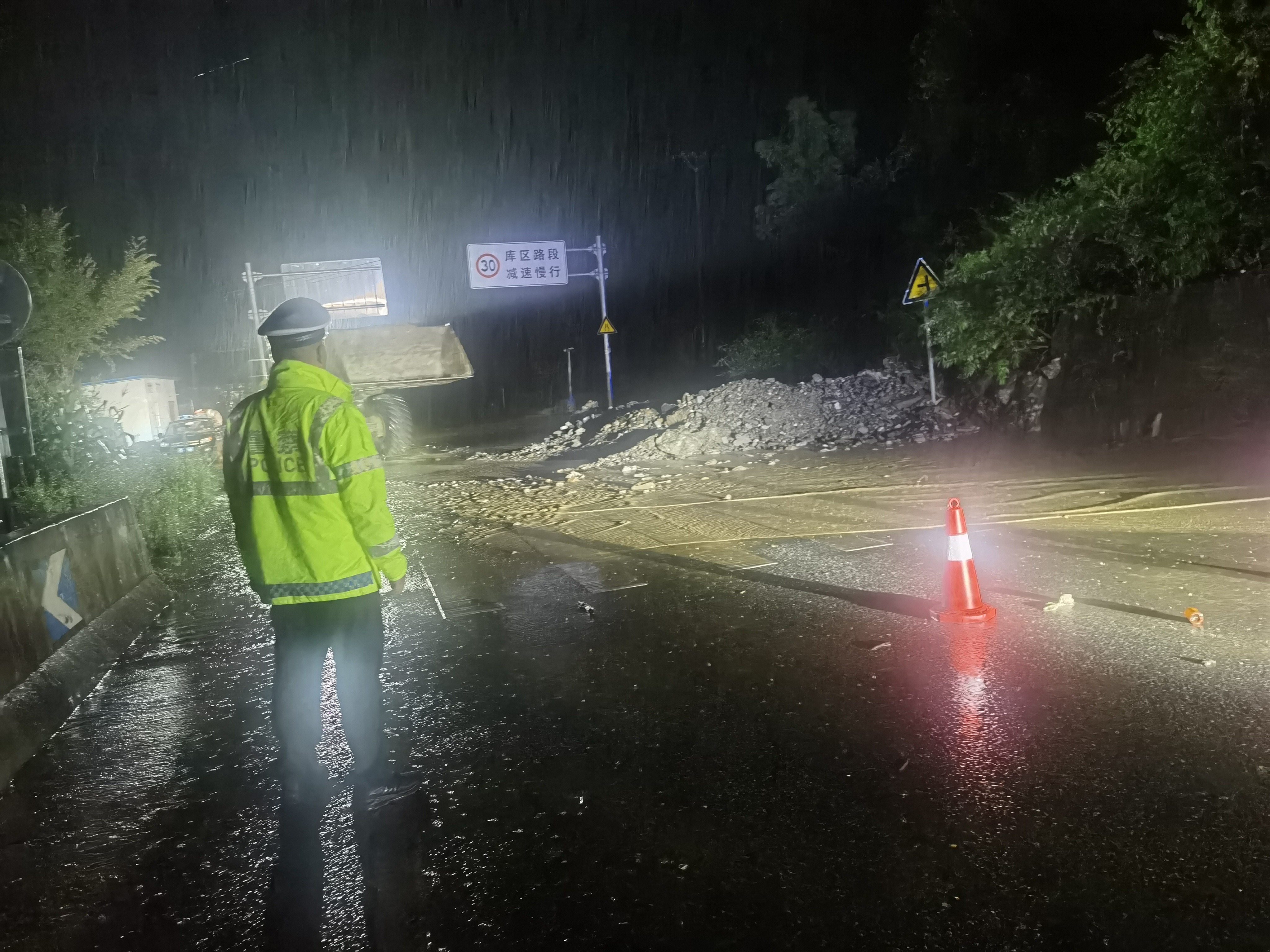 旬陽(yáng)市公安交警持續(xù)堅(jiān)守防汛一線,無(wú)畏風(fēng)雨、無(wú)懼危險(xiǎn),開(kāi)展交通管控、救援救助、應(yīng)急處突、隱患排除等相關(guān)工作,全力保障人民群眾生命財(cái)產(chǎn)安全。暴雨中,交警身著熒光綠雨衣,不畏風(fēng)雨,堅(jiān)守在重要路段,對(duì)有滑坡、落石等危險(xiǎn)路段及具有安全風(fēng)險(xiǎn)的臨水臨崖路段,采取臨時(shí)禁行的管制措施,引導(dǎo)過(guò)往車輛繞行,注意行車安全,協(xié)同相關(guān)部門現(xiàn)場(chǎng)進(jìn)行清理,對(duì)不能現(xiàn)場(chǎng)處理的隱患及時(shí)上報(bào),確保排險(xiǎn)不留盲點(diǎn)、隱患不留死角。同時(shí)加強(qiáng)道路的巡邏管控,通過(guò)遠(yuǎn)端分流,引導(dǎo)車輛、行人安全有序通行,確保群眾出行安全。以雨為令,以夜為伴,逆風(fēng)而行,通宵達(dá)旦,風(fēng)雨中,一抹抹“熒光綠”在熠熠閃光。