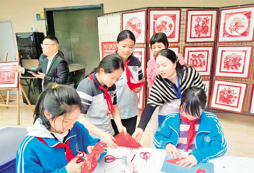 走進(jìn)張莉的課堂里,滿目色彩繽紛的剪紙作品,大大小小地陳列在展臺(tái)處。整整齊齊的桌凳圍成一個(gè)個(gè)不同形狀,以便于學(xué)生更好地進(jìn)行交流。她用學(xué)生通俗易懂的語言為學(xué)生傳授剪紙技巧:“同學(xué)們,我們首先把需要用的彩紙對(duì)折接著裁剪出合適的大小。然后再描出自己想要剪出的形狀……”通過紙張?jiān)谥讣鈦砘胤D(zhuǎn),手中的剪刀“咔嚓咔嚓”,一幅幅美輪美奐的作品便呈現(xiàn)在眼前。每周張莉都要給學(xué)生們上幾節(jié)美術(shù)課,這也讓很多學(xué)生對(duì)剪紙產(chǎn)生了濃厚的興趣,創(chuàng)造出很多優(yōu)秀作品。