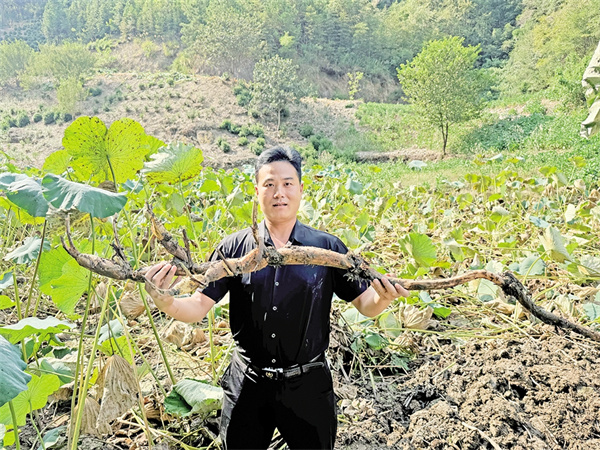 蒿坪鎮(zhèn)王家河村蓮藕喜獲豐收,包村干部為蓮藕作宣傳。 劉姝含 攝