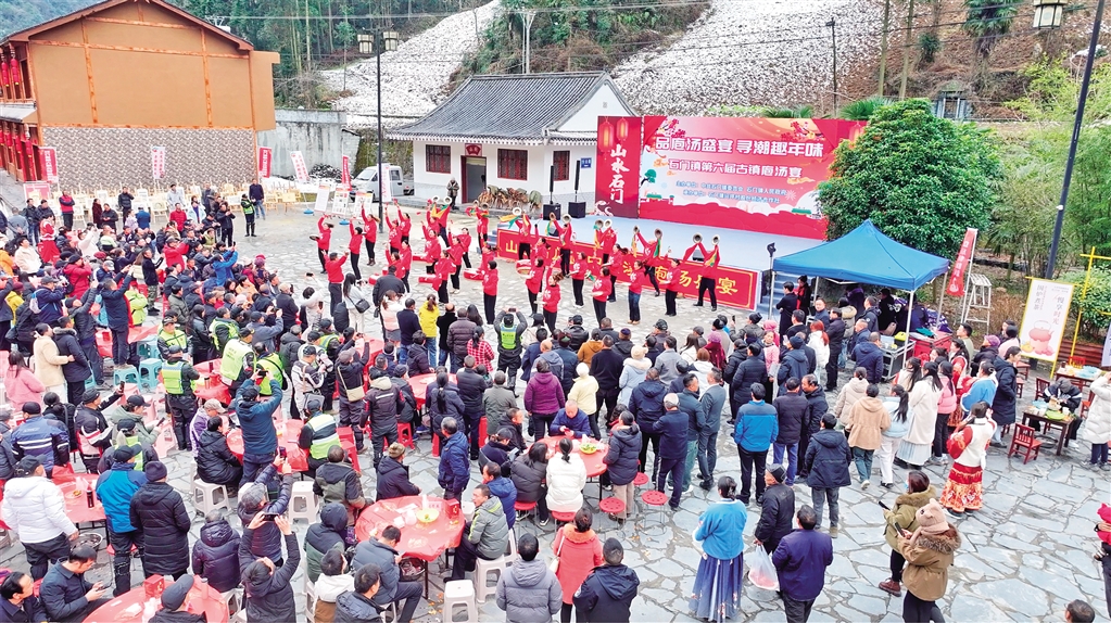 據(jù)了解,為了準(zhǔn)備此次庖湯宴,去年12月底,石門鎮(zhèn)總投資120余萬元開始進(jìn)行橫溪古鎮(zhèn)舊房改造提升項(xiàng)目,著力打造“古鎮(zhèn)庖湯宴”品牌。經(jīng)過項(xiàng)目改造,古鎮(zhèn)完成全面升級(jí)。不僅如此,石門鎮(zhèn)政府還不斷通過“線上+線下”的宣傳方式,提升當(dāng)?shù)芈糜螛I(yè)影響力,積極制作旅游宣傳視頻,此次活動(dòng)帶動(dòng)引流2000人次。(柯明宇 攝)