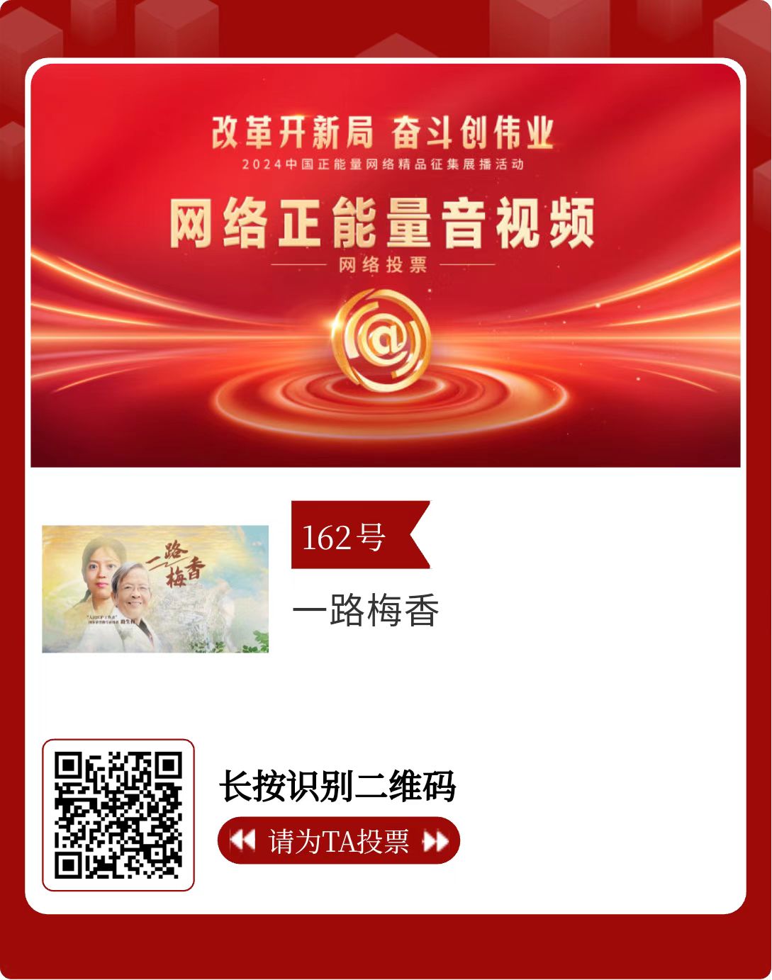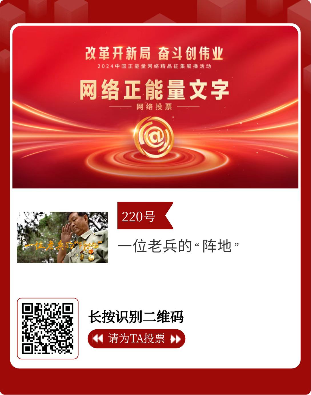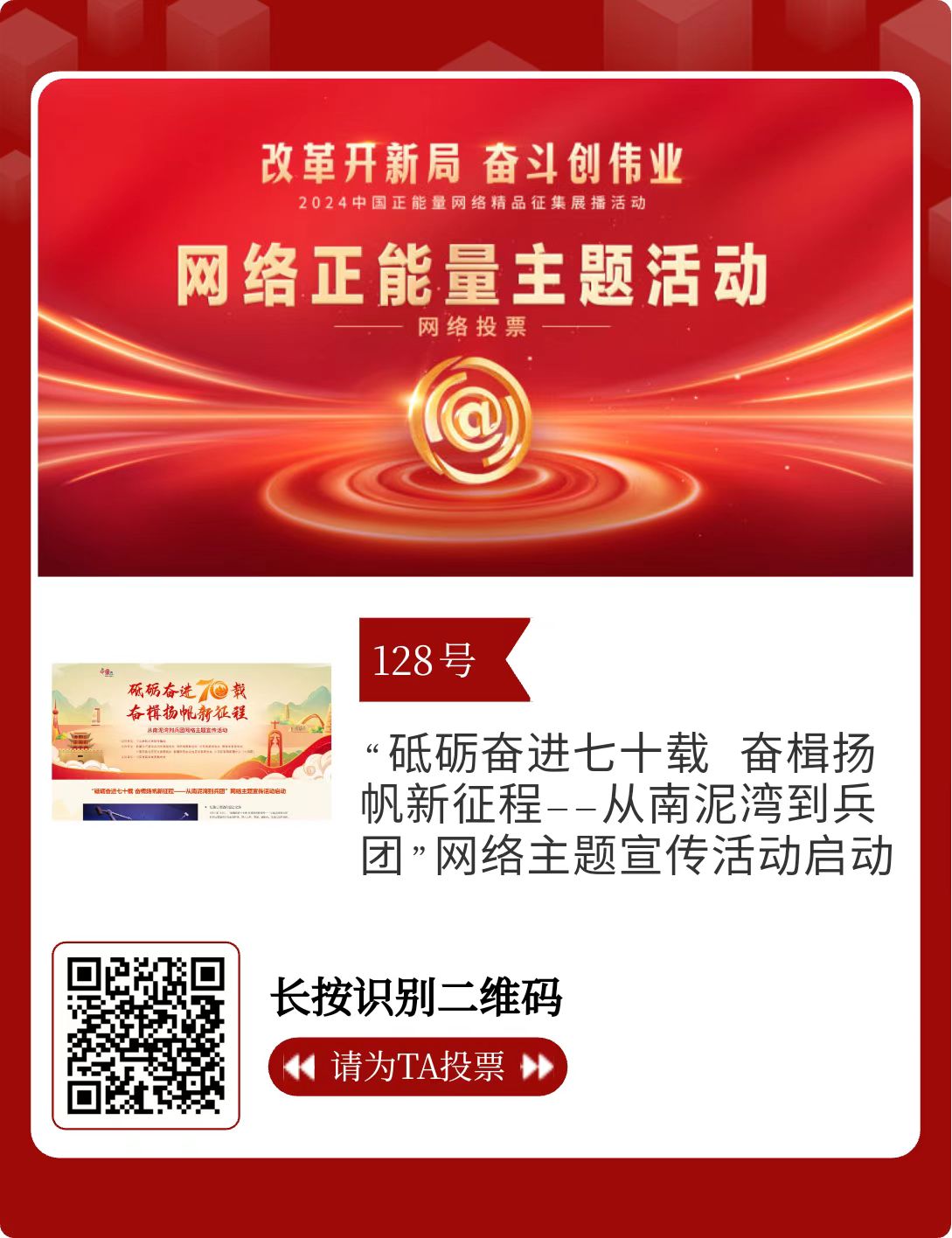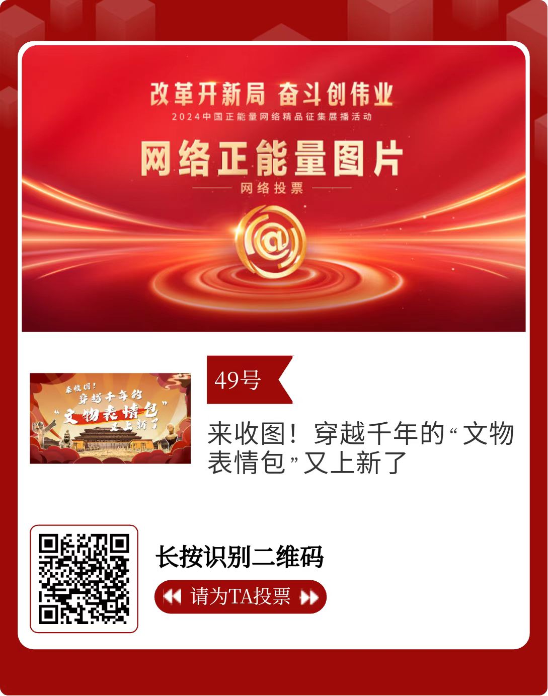 改革開新局,奮斗創(chuàng)偉業(yè)。由中央網(wǎng)信辦主辦的2024中國正能量網(wǎng)絡精品征集展播活動今天啟動網(wǎng)絡展播投票。