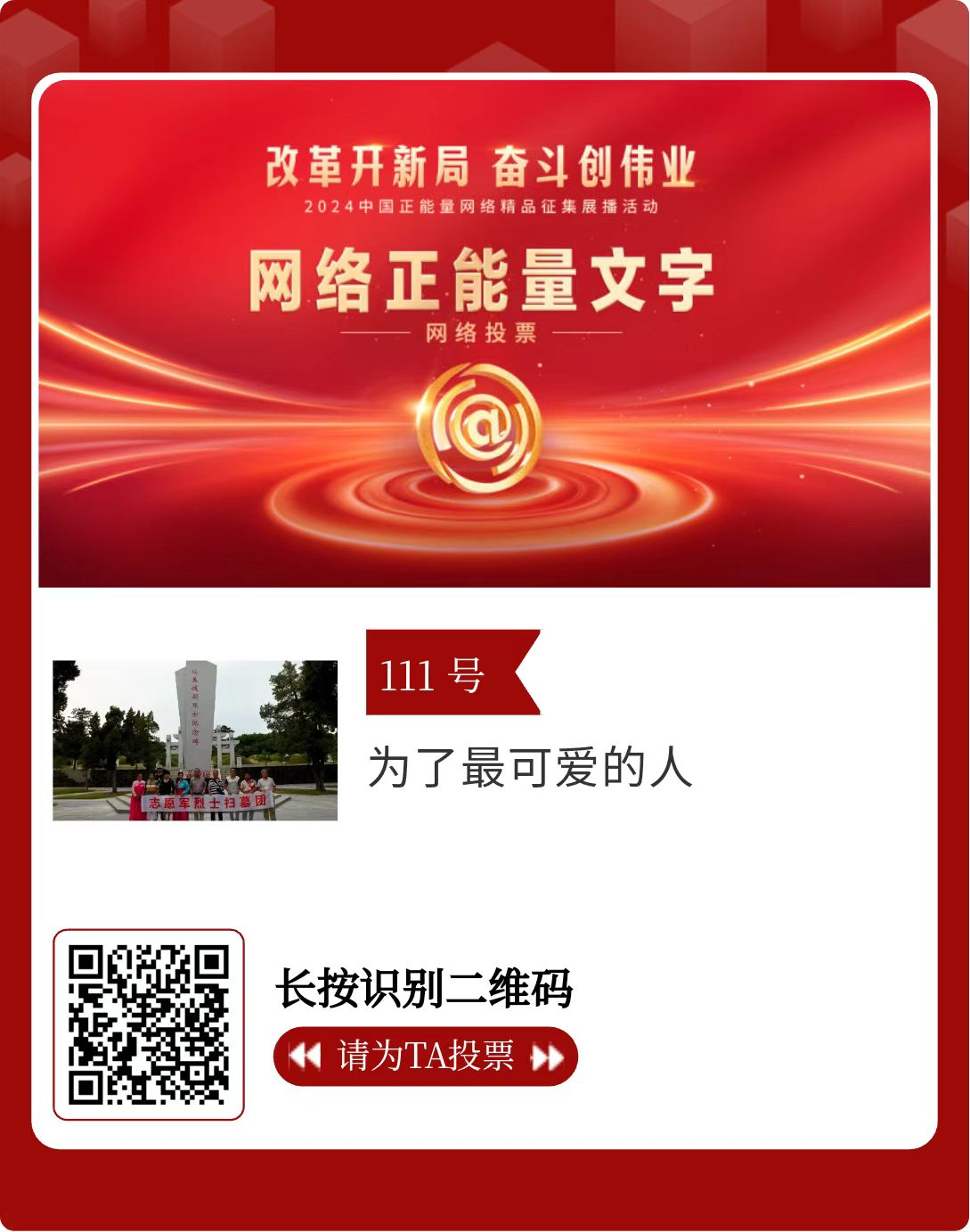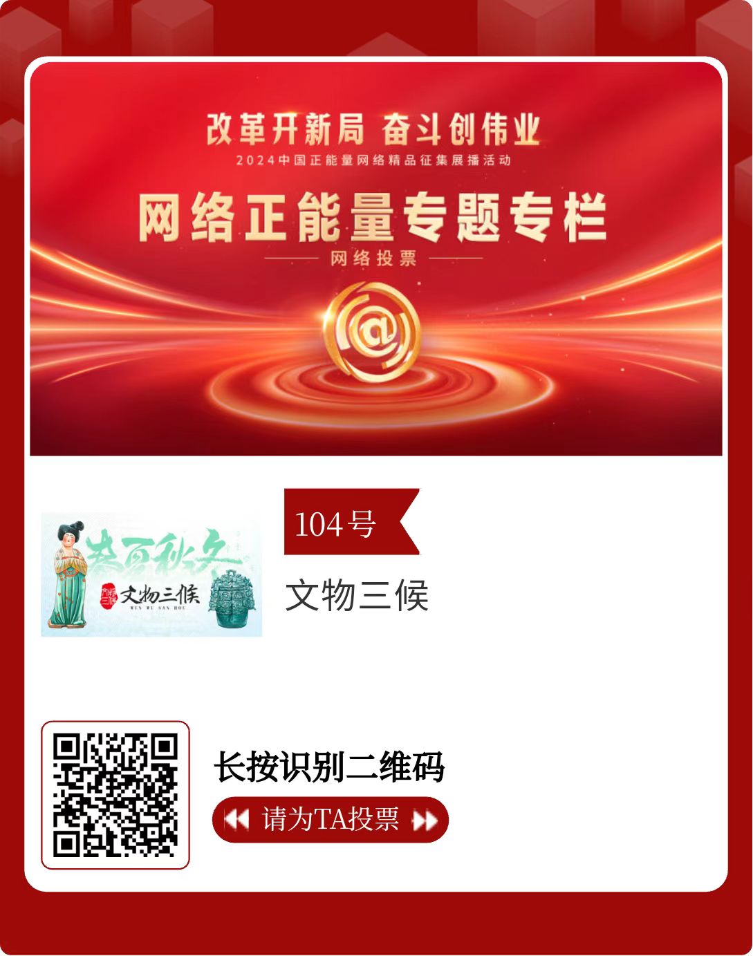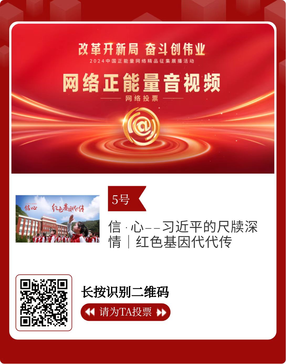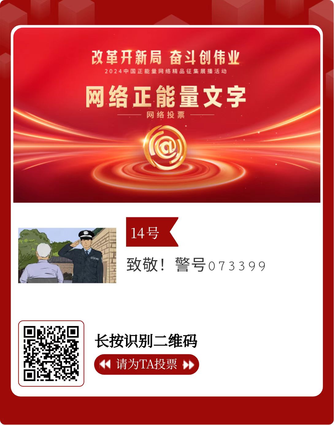 改革開新局,奮斗創(chuàng)偉業(yè)。由中央網(wǎng)信辦主辦的2024中國正能量網(wǎng)絡精品征集展播活動今天啟動網(wǎng)絡展播投票。
