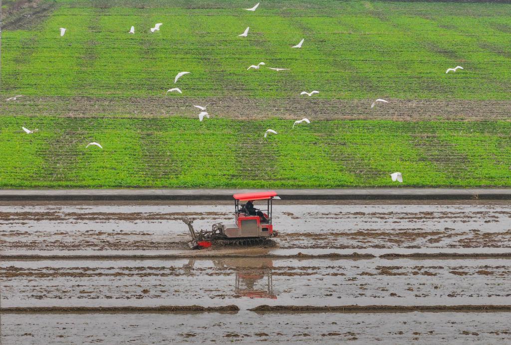 2月25日,在浙江省瑞安市馬嶼鎮(zhèn)儒陽村,農(nóng)機(jī)在田間犁地,白鷺低空而飛(無人機(jī)照片)。早春時(shí)節(jié),各地農(nóng)民搶抓農(nóng)時(shí),開展春耕、春管等農(nóng)事活動(dòng),田間地頭到處是一派人勤春早的忙碌景象。 新華社發(fā)(蘇巧將攝)