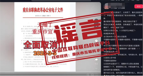 真相:近日,有網(wǎng)民在互聯(lián)網(wǎng)平臺(tái)發(fā)布消息稱(chēng)“重慶市宣布,申請(qǐng)?jiān)u審的要求取消了很多條條框框,職稱(chēng)申請(qǐng)不看前置職稱(chēng),全日制本科十年直接認(rèn)定副高,不需要中級(jí)職稱(chēng)”,引發(fā)關(guān)注。經(jīng)核實(shí),網(wǎng)傳信息系謠言。職稱(chēng)評(píng)審均需逐級(jí)晉升,取得上一級(jí)職稱(chēng)并滿(mǎn)足相應(yīng)學(xué)歷資歷條件后方可晉升高一級(jí)職稱(chēng)。目前重慶市除特殊人才、博士后等3個(gè)針對(duì)特定對(duì)象的職稱(chēng)申報(bào)綠色通道外,正常申報(bào)通道均需逐級(jí)晉升。網(wǎng)傳文件是網(wǎng)民通過(guò)P圖軟件編輯而成,試圖吸引不明真相的群眾咨詢(xún),借機(jī)推銷(xiāo)職稱(chēng)代辦服務(wù),收取高額費(fèi)用。目前,謠言線索已轉(zhuǎn)交公安機(jī)關(guān)進(jìn)一步調(diào)查處置。(來(lái)源:“重慶辟謠”微信公眾號(hào))