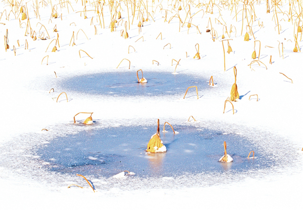 我的攝影創(chuàng)作圍繞生命的痕跡、時(shí)間的隱喻兩個(gè)主題。在《嘉實(shí)擷芳·野圃瑤音》中,菜園的微觀生態(tài)被賦予交響樂般的節(jié)奏——葫蘆藤的螺旋曲線是生命的律動,西紅柿根莖的垂直排列是生長的秩序,蚜蟲蝕痕的細(xì)節(jié)則暗喻生態(tài)的共生與抗?fàn)?。而在《澄漪棹影·沙月溯光》里,榮成海岸的冬夏對比成為時(shí)間的隱喻,結(jié)冰湖面上的凋敗蓮蓬是流逝凝固的時(shí)光,夏日海邊的金色水洼則是流動的永恒。我癡迷于捕捉這種矛盾與共生——就像用冷暖色調(diào)碰撞出畫面的張力,也用虛實(shí)構(gòu)圖處理每一張照片,期待每一張照片是個(gè)性鮮明,讓人耳目一新。