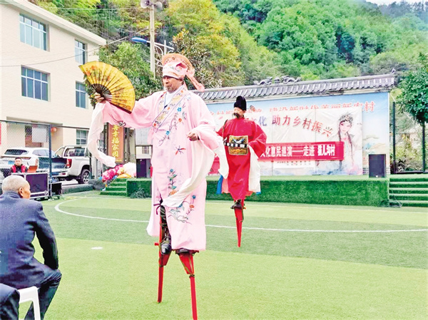 在五峰村,村支部書記羅仁春告訴記者,2023年村委會牽頭成立了五峰村文化民俗文藝協(xié)會,陸續(xù)加入的48名會員涵蓋老中青三代,既有傳承高蹺絕技的老人,也有主動學習弦子腔的年青一代。今年32歲的村民小梅加入?yún)f(xié)會后,一改往日下班后悶在家中的狀態(tài),每天下午吃完飯都會下樓和新認識的姐妹載歌載舞,很快就成為舞蹈隊的主力?!耙郧安恢牢覀兇迳线€有文藝協(xié)會,自從村上干部告訴我后,我就趕緊加入了這個小團體,既鍛煉了身體,又愉悅了心情,生活幸福感越來越強烈?!鄙碇璧阜男∶飞碜随鼓龋滹w揚間,明媚的笑容如花一樣燦爛。