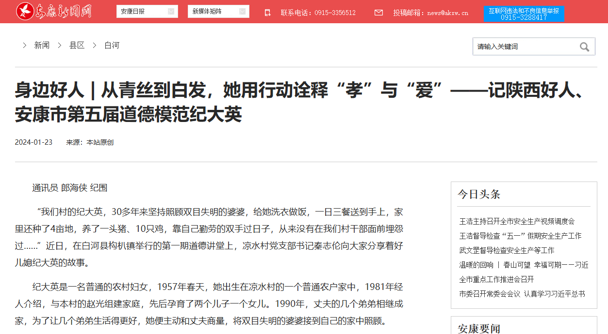 《身邊好人 | 從青絲到白發(fā),她用行動(dòng)詮釋“孝”與“愛”——記陜西好人、安康市第五屆道德模范紀(jì)大英》(2024-01-23發(fā)布)