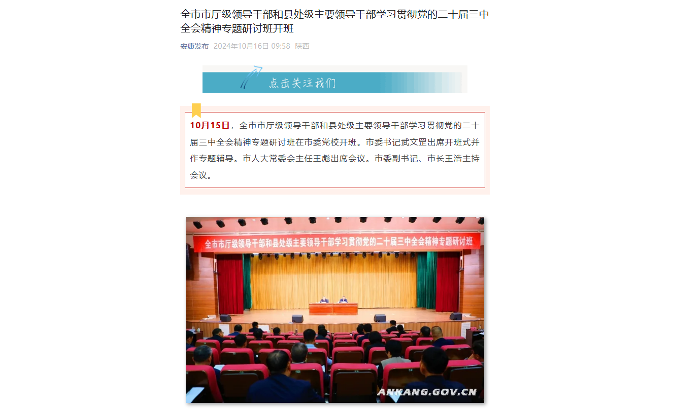 《全市市廳級(jí)領(lǐng)導(dǎo)干部和縣處級(jí)主要領(lǐng)導(dǎo)干部學(xué)習(xí)貫徹黨的二十屆三中全會(huì)精神專題研討班開班》(2024-10-16發(fā)布于安康發(fā)布公眾號(hào))