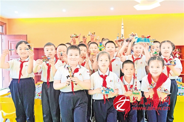 與古箏社團(tuán)室相鄰的“樂(lè)拼未來(lái)”樂(lè)高室里,學(xué)生們正分組搭建自己喜歡的模型。江蘇金壇捐贈(zèng)的樂(lè)高設(shè)備,為學(xué)校開(kāi)展科創(chuàng)教育提供了有力支撐。過(guò)去,學(xué)校課程以理論教學(xué)為主,現(xiàn)在孩子們可以通過(guò)動(dòng)手實(shí)踐,將創(chuàng)意轉(zhuǎn)化為現(xiàn)實(shí)。學(xué)校依托這些資源,成立了數(shù)學(xué)思維訓(xùn)練社團(tuán)。社團(tuán)以提升學(xué)生綜合素養(yǎng)為核心目標(biāo),著重培養(yǎng)學(xué)生專(zhuān)注力與沉穩(wěn)耐心的學(xué)習(xí)品質(zhì)。訓(xùn)練過(guò)程中,學(xué)生不僅需要通過(guò)動(dòng)手實(shí)踐與腦力思考開(kāi)展科學(xué)探究,還需在零件拼接的實(shí)踐活動(dòng)中,以細(xì)致嚴(yán)謹(jǐn)?shù)膽B(tài)度反復(fù)嘗試,逐步探索出正確的拼接方式,在實(shí)踐中深化對(duì)數(shù)學(xué)思維的理解與運(yùn)用。
