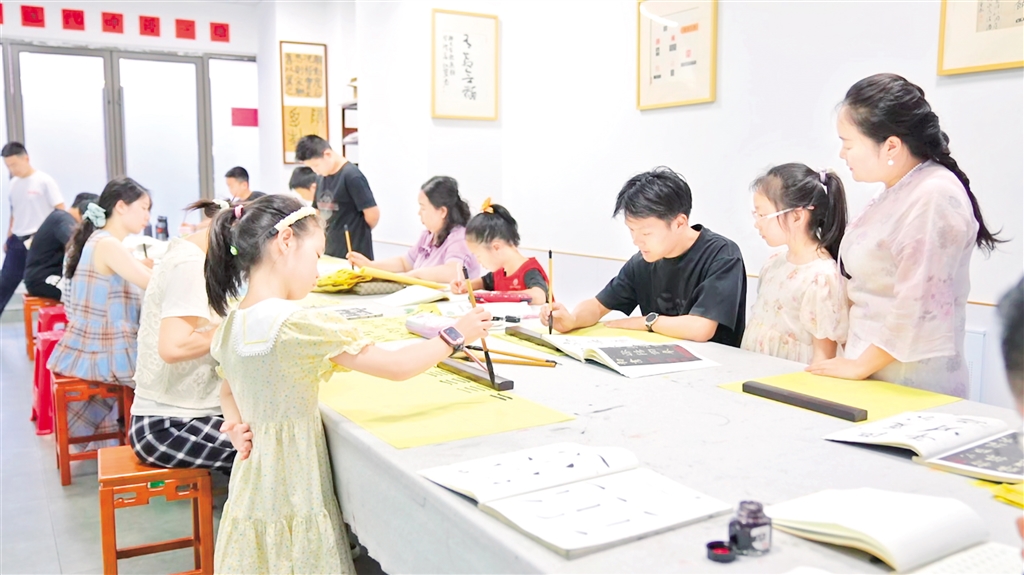 “我們來(lái)看下這‘海’字,是左右結(jié)構(gòu)的字,左邊的偏旁是一個(gè)三點(diǎn)水,三點(diǎn)水寫的時(shí)候要注意連貫性……”書法老師細(xì)致地拆解著漢字的書寫技巧,耐心指導(dǎo)著現(xiàn)場(chǎng)的每一位學(xué)員。