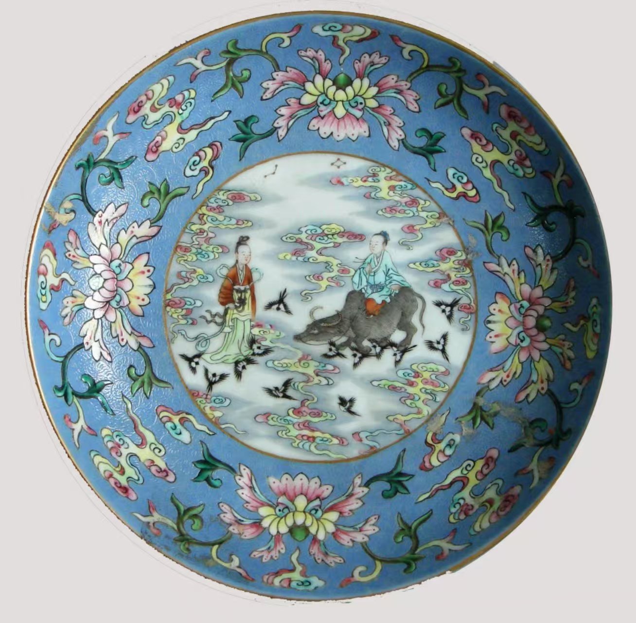 北京藝術博物館收藏的清代景德鎮(zhèn)官窯粉彩人物圖盤,就像一幅流動的七夕畫卷。此盤工藝精湛,口沿涂金,熠熠生輝,盡顯皇家氣派。盤內外壁采用“粉彩軋道”工藝,天藍釉地上淺淺的卷草紋似微風輕拂,粉彩花卉與朵云紋相互映襯,如夢如幻。盤內底描金圓形開光處,粉彩繪就的人物故事圖案更為生動:牛郎坐于牛背,手握韁繩,深情凝望;織女身姿婀娜,嬌羞回望,二人似在互訴衷腸。背景中祥云繚繞、星辰閃爍、鵲鳥紛飛,為這場相會營造了浪漫的氛圍。外底“鵲橋仙渡”四字,點明主題。