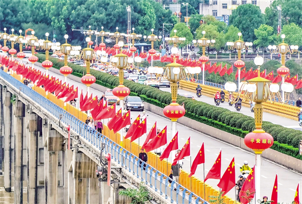 9月25日,我市市政部門對漢江一橋進(jìn)行了裝扮,以迎接即將到來的國慶節(jié)。?