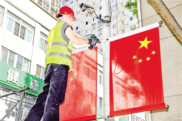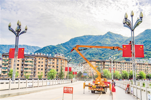 9月25日,紫陽縣城區(qū)橋溝路的大道上,工人正在懸掛國旗。?