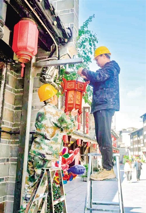 9月24日,石泉縣積極籌備國慶黃金周旅游服務(wù)保障工作。圖為石泉縣漢江古城景區(qū),工作人員正在更換景觀燈。?
