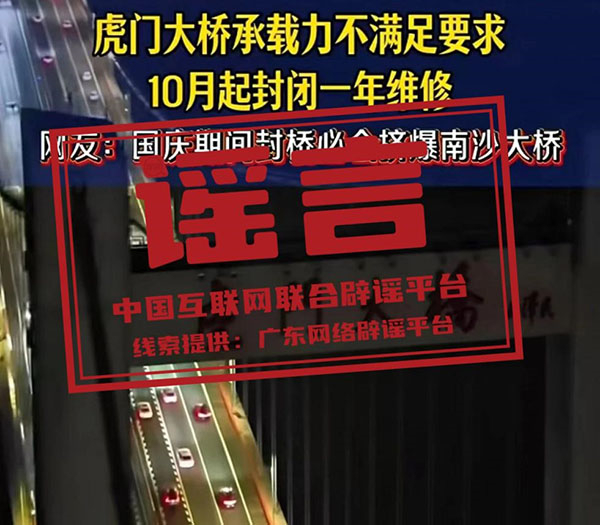 真相:近日,網(wǎng)絡上流傳“虎門大橋10月起封閉維修”的消息。經(jīng)東莞日報記者核實,該信息不準確?;㈤T大橋在國慶假期期間將正常通行且繼續(xù)實行免費政策。9月29日,廣東虎門大橋有限公司明確表示:虎門大橋在2026年春節(jié)前不會采取全封或半封措施,具體封閉時間及方案,目前均未確定。據(jù)悉,此前東莞市發(fā)展和改革局曾發(fā)布過相關評估前的公示,其中提到預計開工時間,但并非實際施工時間。(來源:“廣東省互聯(lián)網(wǎng)舉報中心”微信公眾號、東莞日報)