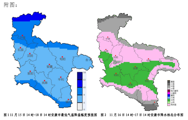受冷空氣影響,15—17日全市過(guò)程日最低氣溫下降8~10℃,最低氣溫將出現(xiàn)在18日和19日清晨,全市大部會(huì)出現(xiàn)今冬初霜凍。預(yù)計(jì)最低氣溫:川道地區(qū)-4~2℃,中高山地區(qū)-8~-4℃,秦巴高山局地低于-8℃。16日夜間至17日白天我市大部有明顯吹風(fēng)天氣,陣風(fēng)可達(dá)5—6級(jí)。