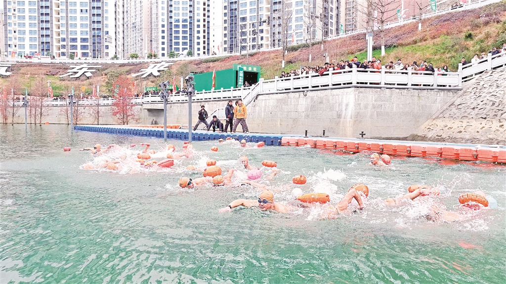 12月21日,陜西省第八屆漢江公開(kāi)水域冬泳賽在紫陽(yáng)縣月畔灣廣場(chǎng)水域舉行。當(dāng)天,來(lái)自陜西、湖北、四川、重慶、河南、內(nèi)蒙古自治區(qū)的44支代表隊(duì)400余名運(yùn)動(dòng)員報(bào)名參賽。(儲(chǔ)茂銀 攝)