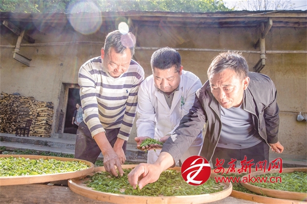“十四五”期間,我市持續(xù)推進茶產業(yè)發(fā)展,努力實現茶產業(yè)“四時有收”。圖為紫陽白茶非遺制作技藝代表性傳承人在高橋鎮(zhèn)裴壩村,向茶農推廣紫陽白茶非遺制作技藝。 李勝璋 攝?
