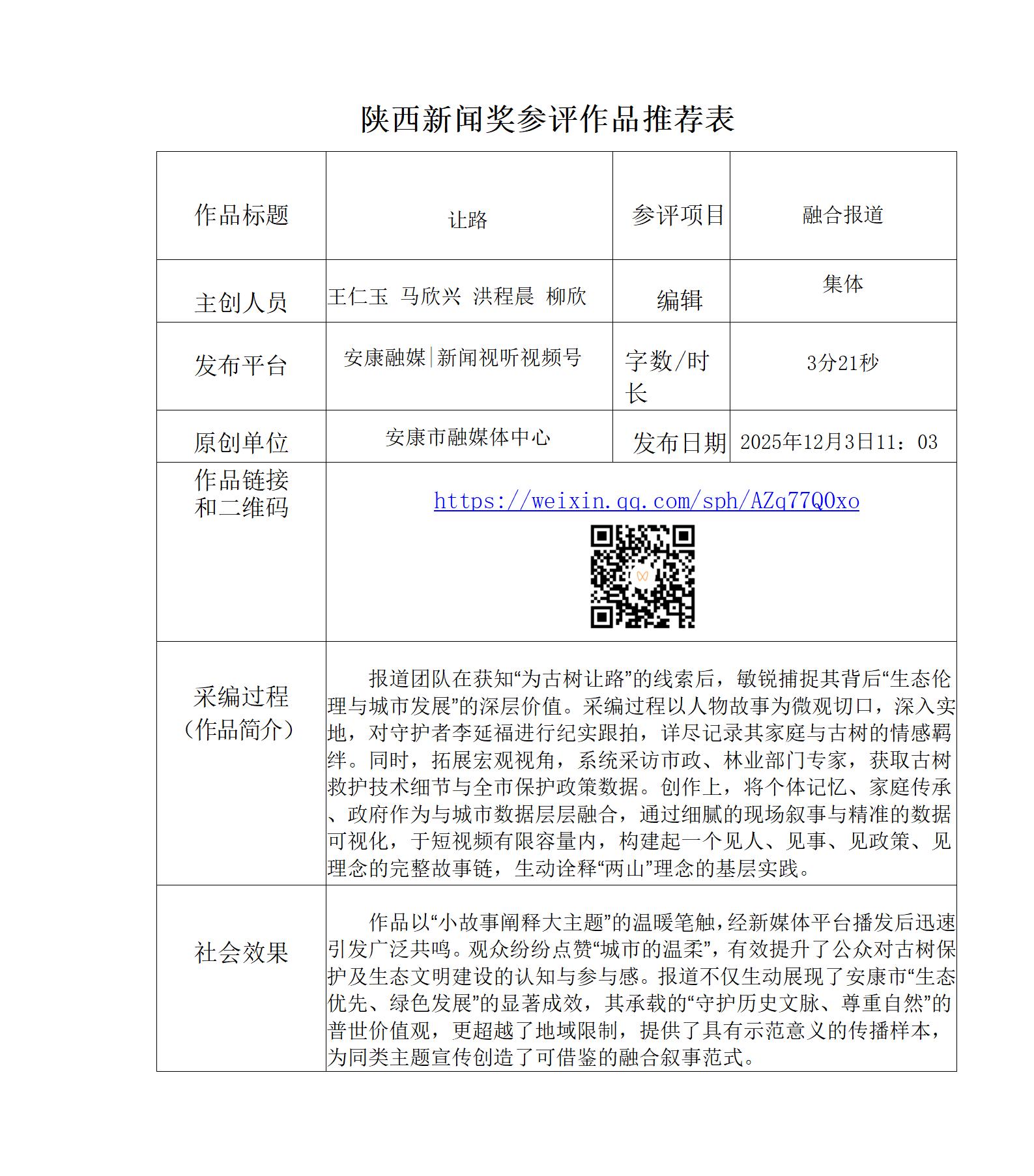 根據(jù)《陜西新聞獎、陜西省優(yōu)秀新聞工作者評選辦法》和《關于開展2025年度陜西新聞獎融合報道、應用創(chuàng)新和新媒體新聞專欄作品推優(yōu)工作的通知》要求,經(jīng)個人申報、部門推薦和中心編委會嚴格篩選,對以下3件2025年度陜西新聞獎融合報道、應用創(chuàng)新、新媒體新聞專欄參評作品進行公示。(作品推薦表附后)