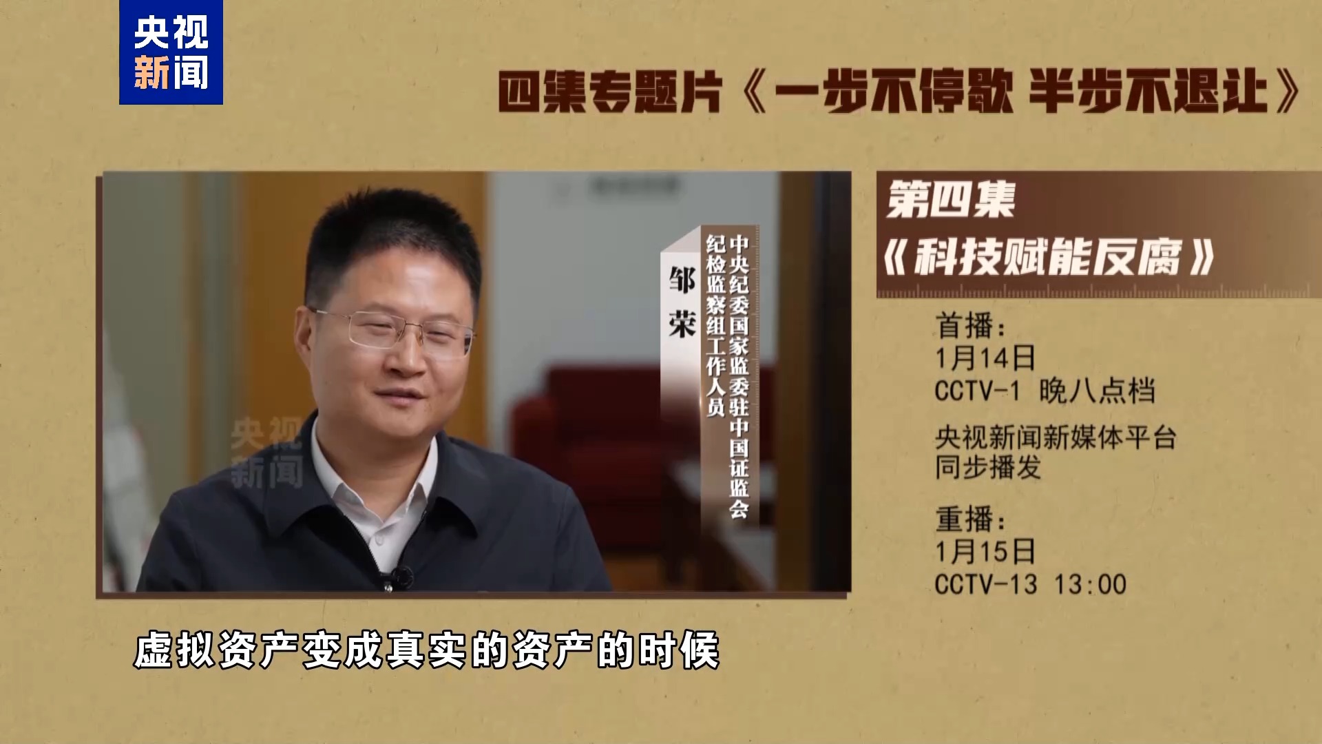 電視專題片《一步不停歇 半步不退讓》第四集《科技賦能反腐》,講述紀(jì)檢監(jiān)察機關(guān)豐富防治新型腐敗和隱性腐敗有效辦法,以信息化賦能正風(fēng)反腐,充分運用科技手段精準(zhǔn)發(fā)現(xiàn)不正之風(fēng)和腐敗問題線索、迅速有效突破案件,著力提升智慧反腐、科技反腐水平。總臺央視綜合頻道1月14日晚8點檔播出,央視新聞新媒體平臺同步播發(fā)。