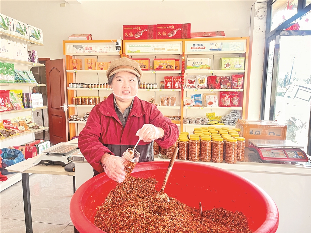 生意有了起色,丈夫的身體也逐漸康復(fù),生活終于重新亮堂起來(lái)。作為鎮(zhèn)人大代表,劉小洪深知,一人富不算富,大家富才是真的富。她主動(dòng)分享直播帶貨經(jīng)驗(yàn),帶動(dòng)周邊村民參與特產(chǎn)加工和網(wǎng)絡(luò)銷售。她優(yōu)先聘請(qǐng)村里的留守婦女和困難家庭來(lái)幫忙,手把手教她們技術(shù)。為了保證產(chǎn)品的純正鄉(xiāng)味,她堅(jiān)持從本村及周邊村采購(gòu)黃豆、辣椒、野油菜、干豇豆等原材料,平均每年收購(gòu)約1萬(wàn)公斤黃豆、2000余公斤辣椒、2000余公斤野油菜及干豇豆,讓鄉(xiāng)親們的農(nóng)產(chǎn)品有了穩(wěn)定銷路,也變成了實(shí)實(shí)在在的收入。