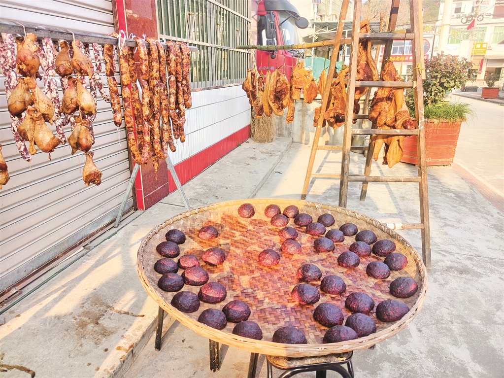 城關(guān)鎮(zhèn)作為漢陰縣的農(nóng)業(yè)大鎮(zhèn)與文旅活鎮(zhèn),轄區(qū)內(nèi)30個(gè)村(社區(qū))的農(nóng)戶們,把冬腌臘肉視作過(guò)年的重要儀式?!靶⊙┻^(guò)后腌臘肉,開(kāi)春都香!”平安村村民李師傅笑著介紹,他家養(yǎng)的本地土豬是吃野菜、粗糧長(zhǎng)大的,肉質(zhì)緊實(shí)肥瘦相間,是成就臘味醇香的基礎(chǔ)。每年他都會(huì)沿襲祖輩的制作工藝,將新鮮五花肉和后腿肉,用麻繩系好瀝干水分,再用粗鹽混合本地花椒、八角等香料逐塊揉搓,確保味道滲進(jìn)肌理,然后將腌好的肉壓上青石板,在陰涼通風(fēng)處?kù)o置三五天,每日翻動(dòng)保證均勻入味,再經(jīng)過(guò)二十天的晾曬,方可完成。制好的臘肉切開(kāi)后瘦肉呈瑪瑙紅色,肥肉如琥珀色,香氣撲鼻。
