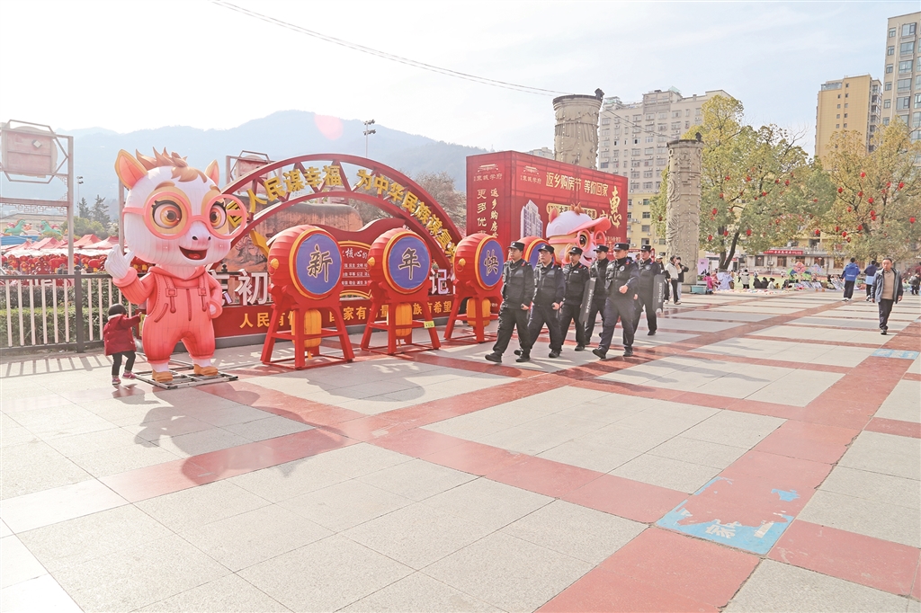 ⑤ 旬陽公安特警春節(jié)期間全警力投入,在重要時段、人群密集場所加強巡邏。李鵬 攝