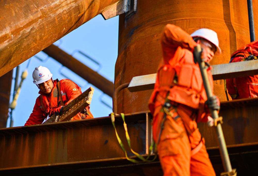 ??2026年2月13日,工人在位于渤海中部海域的渤中26-6油田開(kāi)發(fā)項(xiàng)目(二期)作業(yè)現(xiàn)場(chǎng)施工。新華社記者 趙子碩 攝
