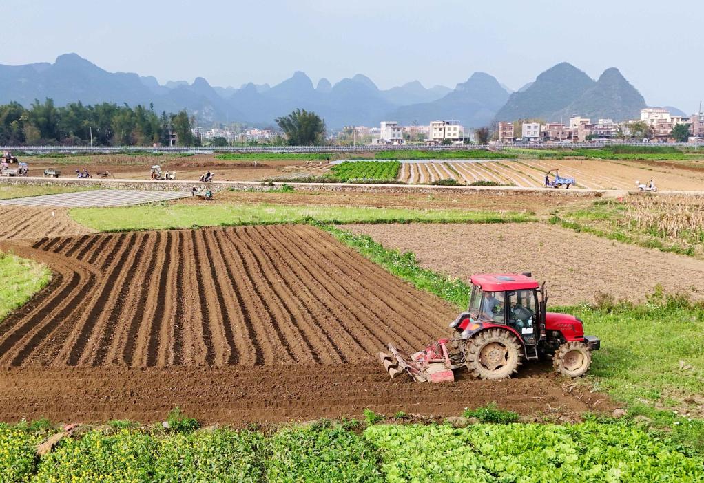 近日,廣西來(lái)賓市忻城縣城關(guān)鎮(zhèn)都樂(lè)村農(nóng)民駕駛農(nóng)機(jī)在翻耕田地,準(zhǔn)備種植玉米(無(wú)人機(jī)照片)。一年之計(jì)在于春,各地人們忙著翻耕土地、培育秧苗、檢修農(nóng)機(jī)、裝運(yùn)化肥,為春耕生產(chǎn)做準(zhǔn)備。新華社發(fā)(樊紹光 攝)
