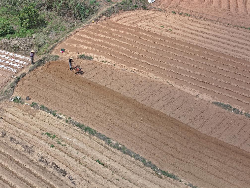 3月1日,村民在廣西南寧市邕寧區(qū)蒲廟鎮(zhèn)田園里耕作(無(wú)人機(jī)照片)。新華社記者 周華 攝