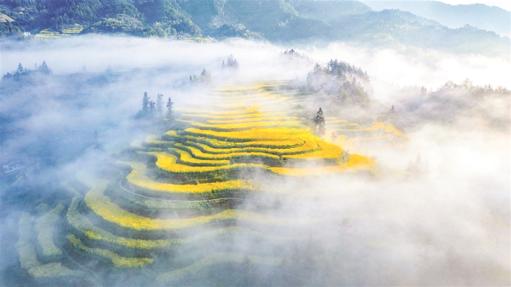 沿著蜿蜒的山路盤(pán)旋而上,轉(zhuǎn)過(guò)一個(gè)山坳,眼前豁然開(kāi)朗——那金黃的油菜花,竟從山腳一直鋪到云端。層層疊疊的梯田,依著山勢(shì)盤(pán)旋而上,每一道田埂都勾勒出柔美的曲線。油菜花便順著這些曲線,開(kāi)得浩浩蕩蕩,開(kāi)得理直氣壯。晨霧未散時(shí),花海在薄紗般的霧氣里若隱若現(xiàn),恍若仙境;待太陽(yáng)升高,霧氣褪去,那金黃便愈發(fā)耀眼,直晃得人瞇起眼睛。風(fēng)過(guò)處,花浪翻涌,從這山傳到那山,沙沙的聲響里,滿是春天的氣息。